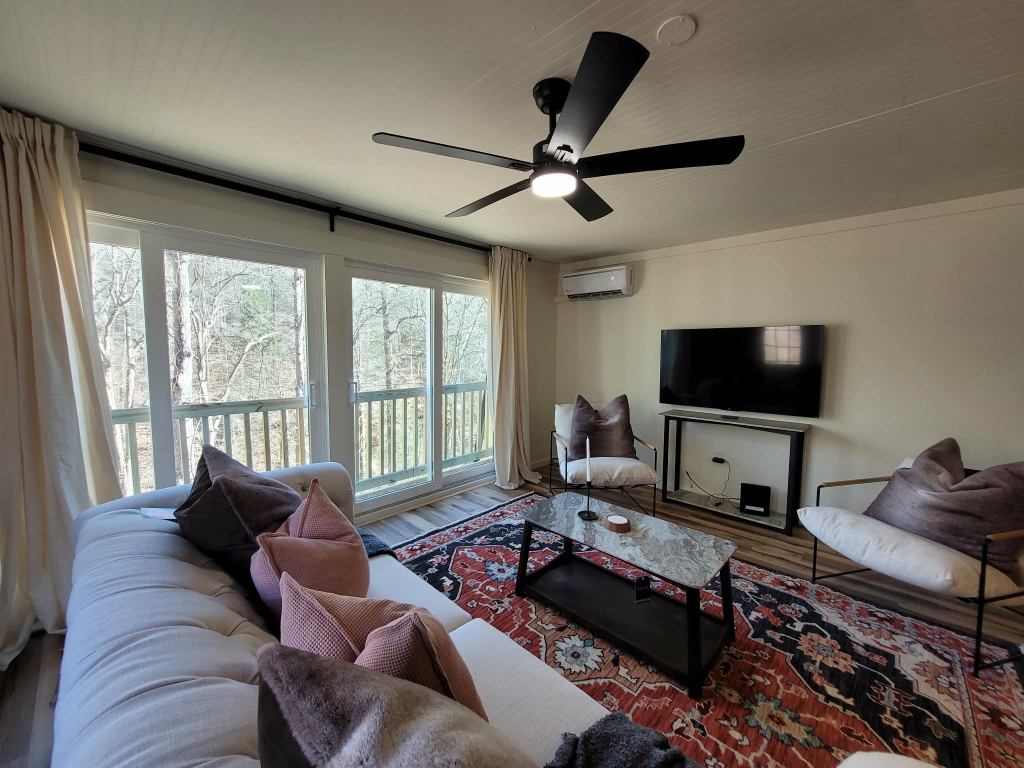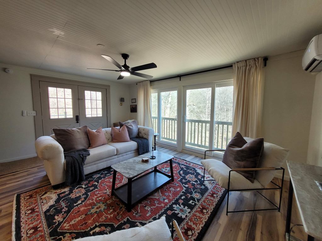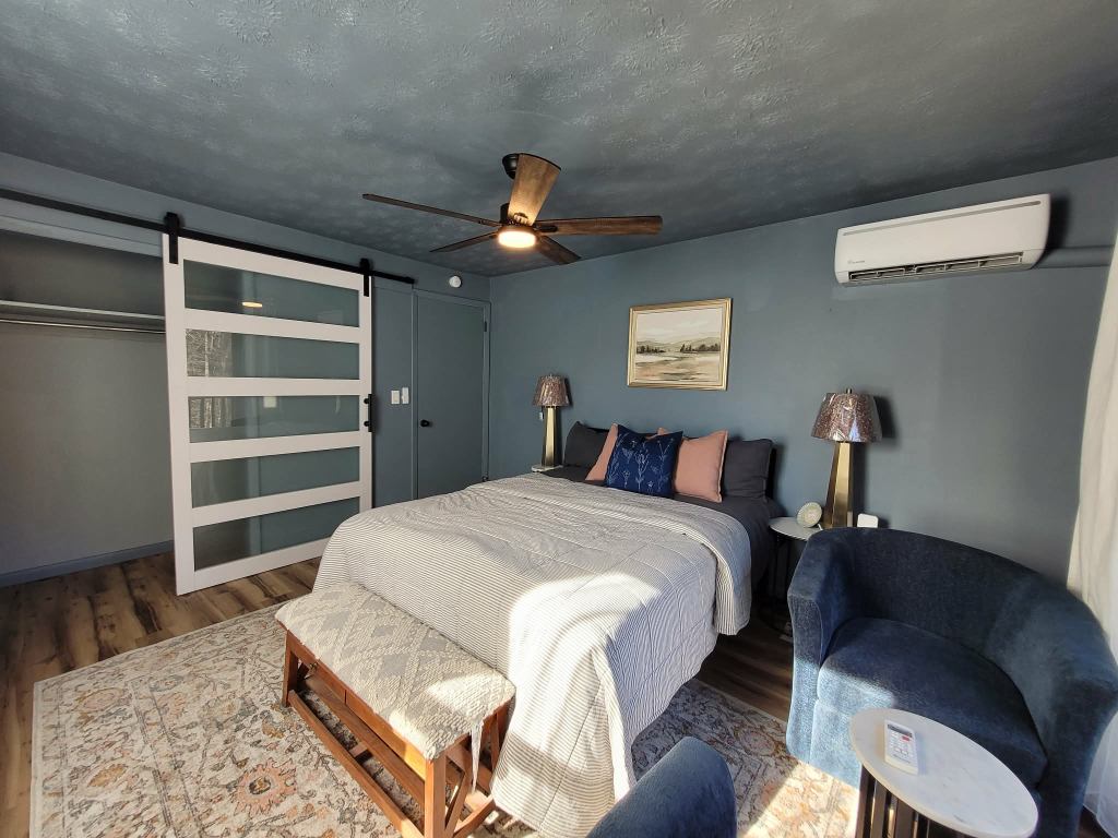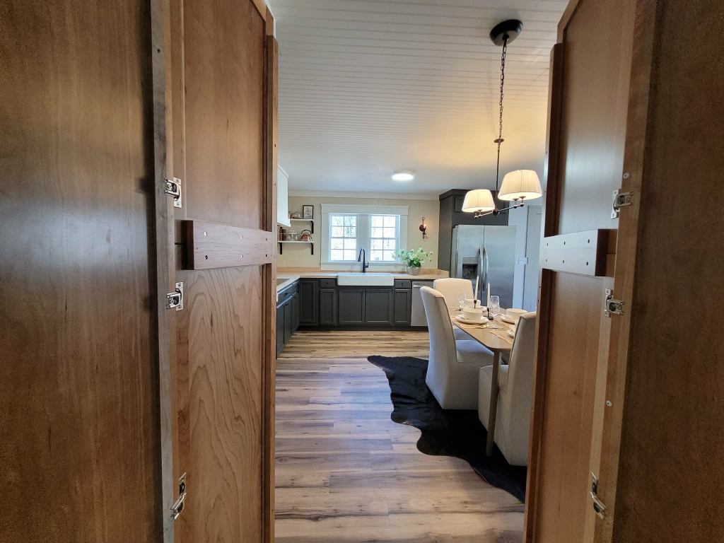 Features like the modern sliding barn door add both function and architectural interest — a small detail that elevates the entire space.