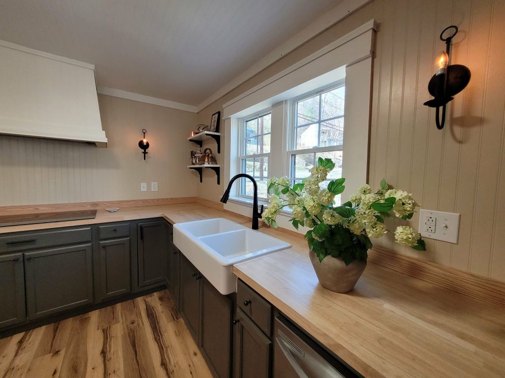 - Deep farmhouse sink positioned under a double window to maximize light and views